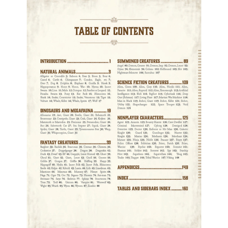 Packed with over 200 creatures, with chapters on natural animals, dinosaurs and megafauna, fantasy creatures, summoned creatures, science fiction creatures such as aliens and robots, and nonplayer characters.