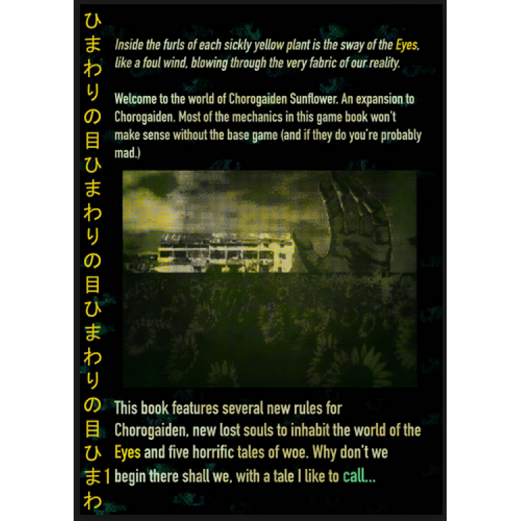 Chorogaiden: Sunflower - A 60 page, approximately 5.5" x 8.5" fully illustrated, expansion Tabletop RPG Rulebook and Artbook in a Zine format.