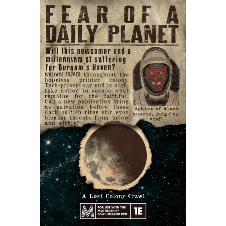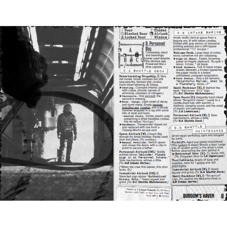 This 36-page lost colony crawl for the sci-fi horror RPG Mothership takes players through a planetary colony built only to print employee handbooks for Etaoin Shrdlu Stellarcomms. Abruptly cut off from the company in its tumultuous switch to a fully digital infrastructure, the colonists were left on their own for the past 1,000 years.