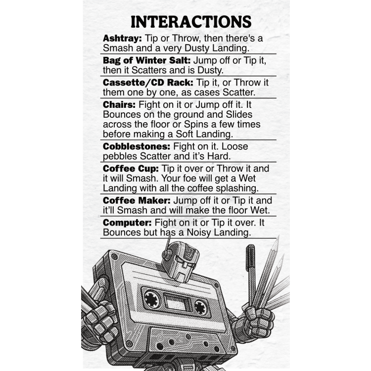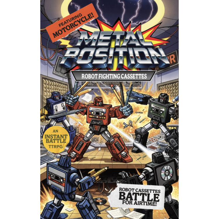 This game is about memory and music, community and sadness in a particular time when the best way to express your feelings was still to record a cassette tape. Metal Position: Robot Fighting Cassettes is an instant battle TTRPG about exchanging mixtapes that turn into robots and making them fight, in and around a community radio station in the mid 2000s.