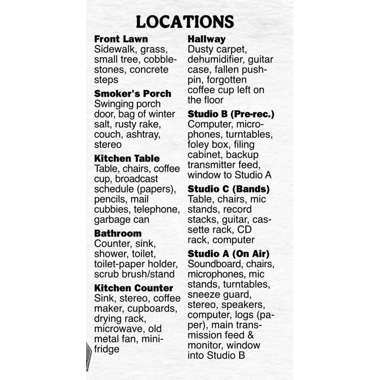 The goal of the game is to get more time on air than your opponent, a fellow programmer at community radio station Trout Radio 99.9 FM, CXXX. Before coming to the station you forgot to write down the track listing for each of your tapes, and you can’t go to air without that. What would you write on the programme logs?