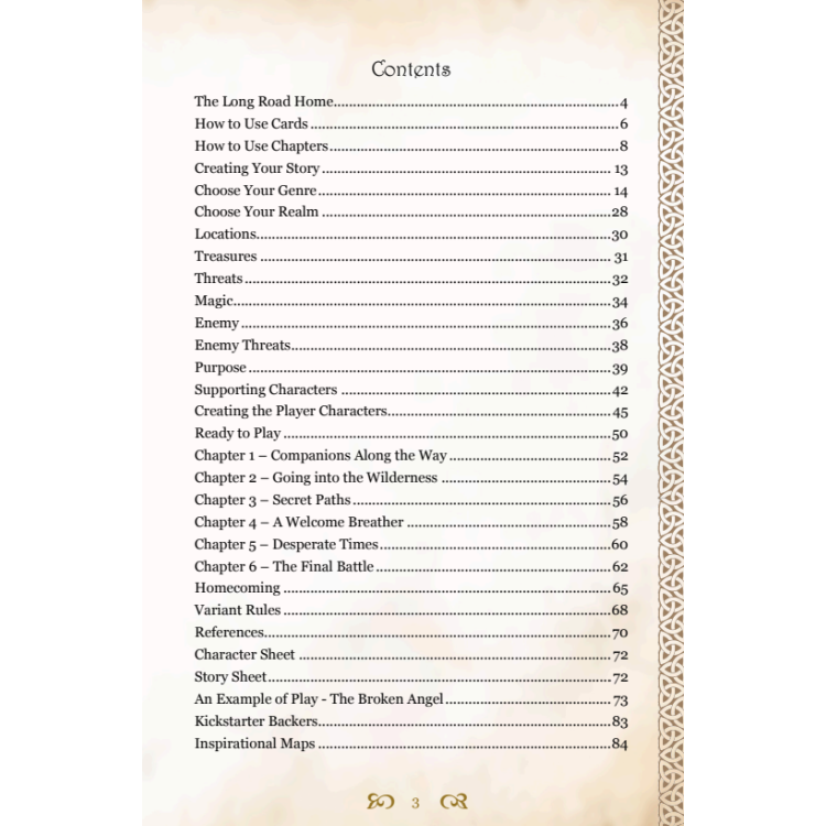 Together you choose a genre, and create the realm and the great enemy of your quest, along with allies and threats. Then as you are returning home you use flashbacks to remember the story of your quest. The highs, the lows, triumphs and tragedies. Ordinary playing cards are used to prompt the emotional content of scenes. You can defeat dragons, tyrants, undead or supernatural foes; across faerie, faded, or other realms.