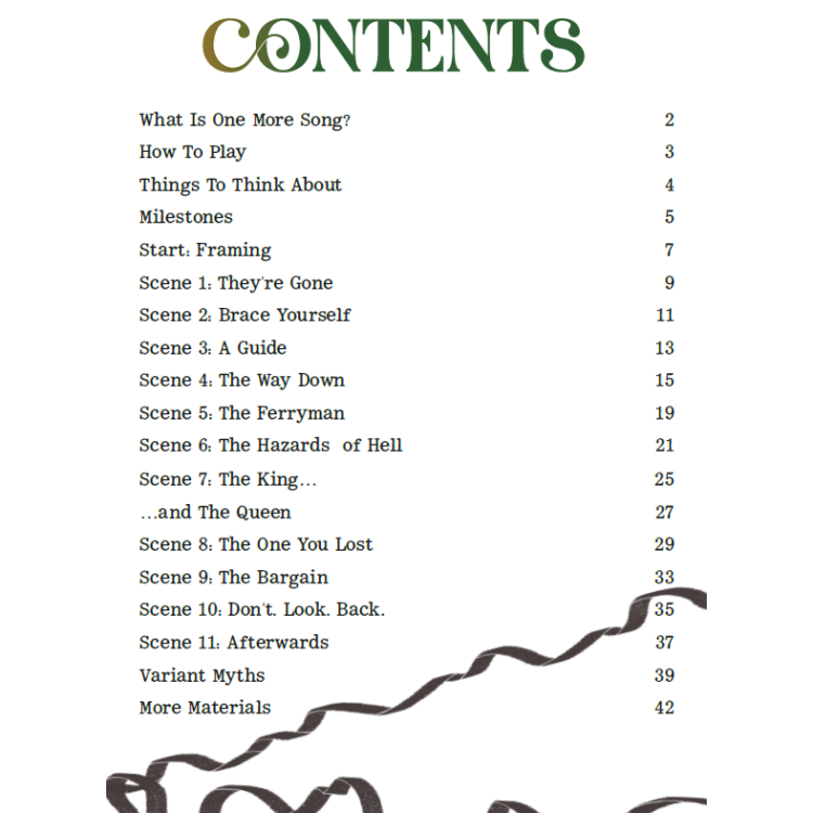 One More Song is a storytelling game that uses a playlist of songs to randomly determine how each scene plays out. It’s a way of telling the story of Orpheus, the son of a Muse who used the magic of his music to convince Hades, the god of the Underworld, to let Orpheus bring his bride, Eurydice, back to life.